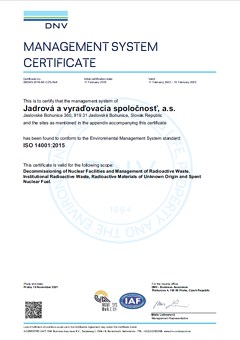 JAVYS, a. s., is the holder of an internationally recognized certificate according to the standard ISO 14001:2015. This international standard defines the requirements for the Environmental Management System. The objective is to achieve and prove the adequate environmental behaviour by managing the impact of the organization’s activities, products and services on the environment, in compliance with its environmental policy and long-term environmental objectives. The meeting of the specified requirements for compliance with standards was confirmed by a certification audit, and thus the organization has been issued a certificate by the certification agency, which is also a testimony to the proper functioning and efficiency of the environmental management system.