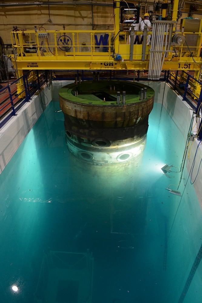 The reactor vessel, weighing more than 204 tons together with the suspension systems, had to be transported from the Unit 1 reactor shaft to the pool located in the fragmentation workplace. Final preparatory activities were performed on Saturday, and on 09:45 a.m. the actual transport of the reactor pressure vessel began. The transport was carried out using the main crane in a reactor hall with a capacity of 250 tons. At approximately 01:00 p.m. the pressure vessel was placed onto a prepared platform in the pool of the wet fragmentation workplace and transport was successfully completed. Implementation of this challenging activity represents the achievement of an important milestone not only in the D4.2 project, but also in the entire V1 NPP decommissioning process.