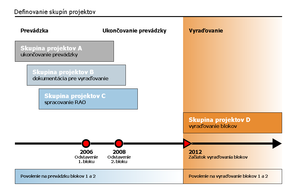 JE V1 ukončila oficiálne svoju prevádzku a vstúpila do etapy vyraďovania. Účinnosť nadobudlo Rozhodnutia ÚJD SR č. 400/2011 "Povolenie na 1. etapu vyraďovania jadrového zariadenia 1. a 2. bloku JE V1". Koncepčne bol spôsob vyraďovania JE V1 zastrešený dvoma základnými dokumentmi - Koncepčný plán vyraďovania JE V1 (projekt BIDSF B6.1) a Správa o hodnotení vplyvov vyraďovania JE V1 na životné prostredie (projekt BIDSF B6.2). Na základe uvedených dokumentov bol vybraný a vedením JAVYS, a.s. a MŽP SR schválený variant vyraďovania JE V1, tzv. „variant kontinuálneho vyraďovania“. Hlavným dôvodom tejto preferencie bolo zachovanie kontinuity spracovania rádioaktívnych odpadov na existujúcich zariadeniach a prenosu vedomostí a znalostí zariadení JE V1. Činnosti a spôsob realizácie kontinuálneho variantu vyraďovania JE V1 boli nadefinované v Pláne 1. etapy vyraďovania JE V1 (projekt BIDSF B6.3). Tento dokument spolu so Stratégiou vyraďovania JE V1 vypracovanej Konzultantom PMU sú základnými strategickými podkladmi pre nadefinovanie projektov, spôsob ich realizácie a trvanie, ako aj stanovenie nákladov potrebných na ich realizáciu.