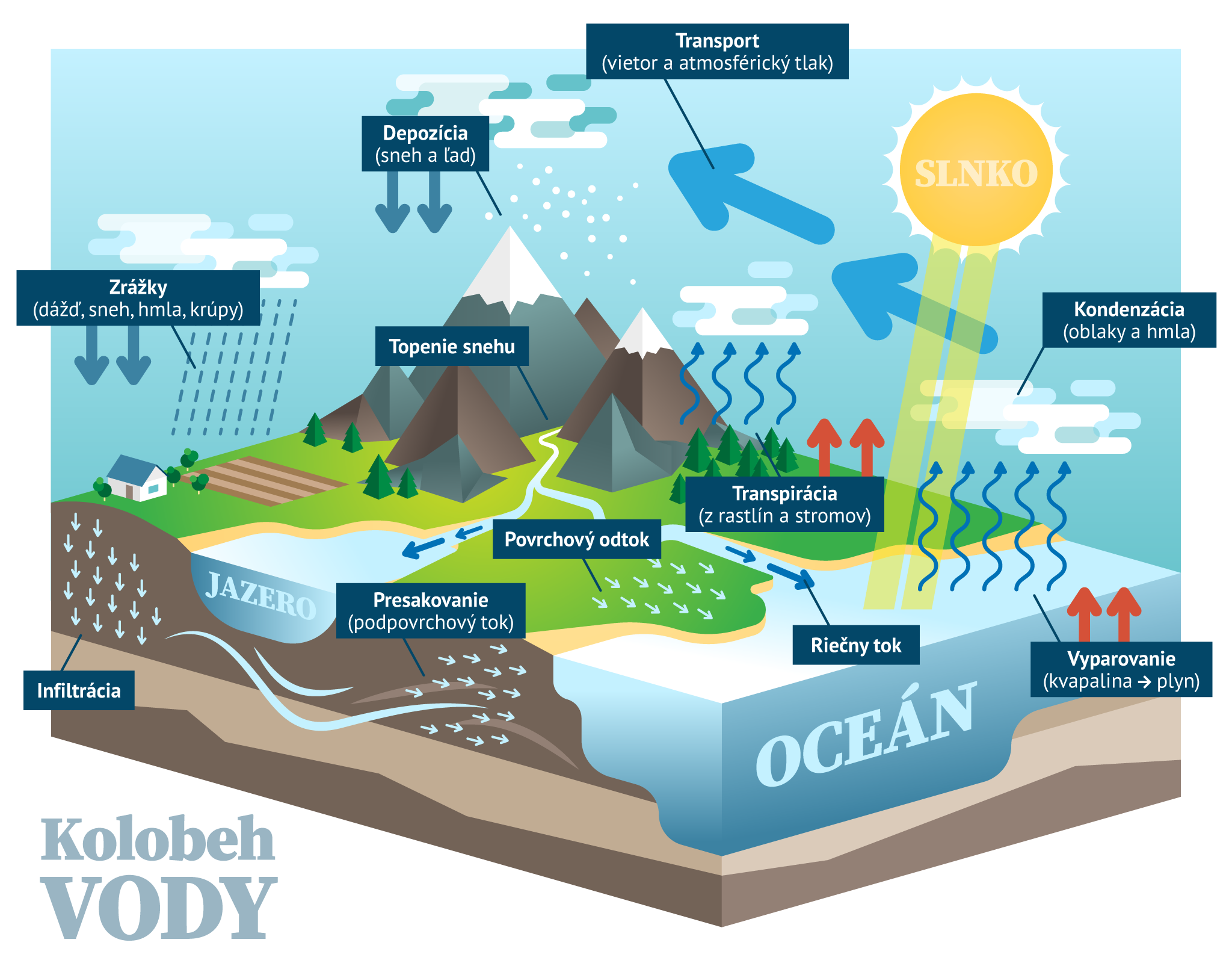 Neustály pohyb vody na Zemi prostredníctvom vyparovania, transportu a kondenzácie. Celkové množstvo vody na Zemi zostáva približne konštantné, avšak energia slnečného žiarenia dopadajúceho na zemský povrch udržiava molekuly vody v nepretržitom pohybe. Voda sa vyparuje z vodných plôch, pôdy alebo prostredníctvom transpirácie rastlín. V atmosfére je prenášaná prúdmi vzduchu a za vhodných podmienok kondenzuje. Následne sa vracia na zemský povrch vo forme rosy, dažďa, snehu alebo krúp.