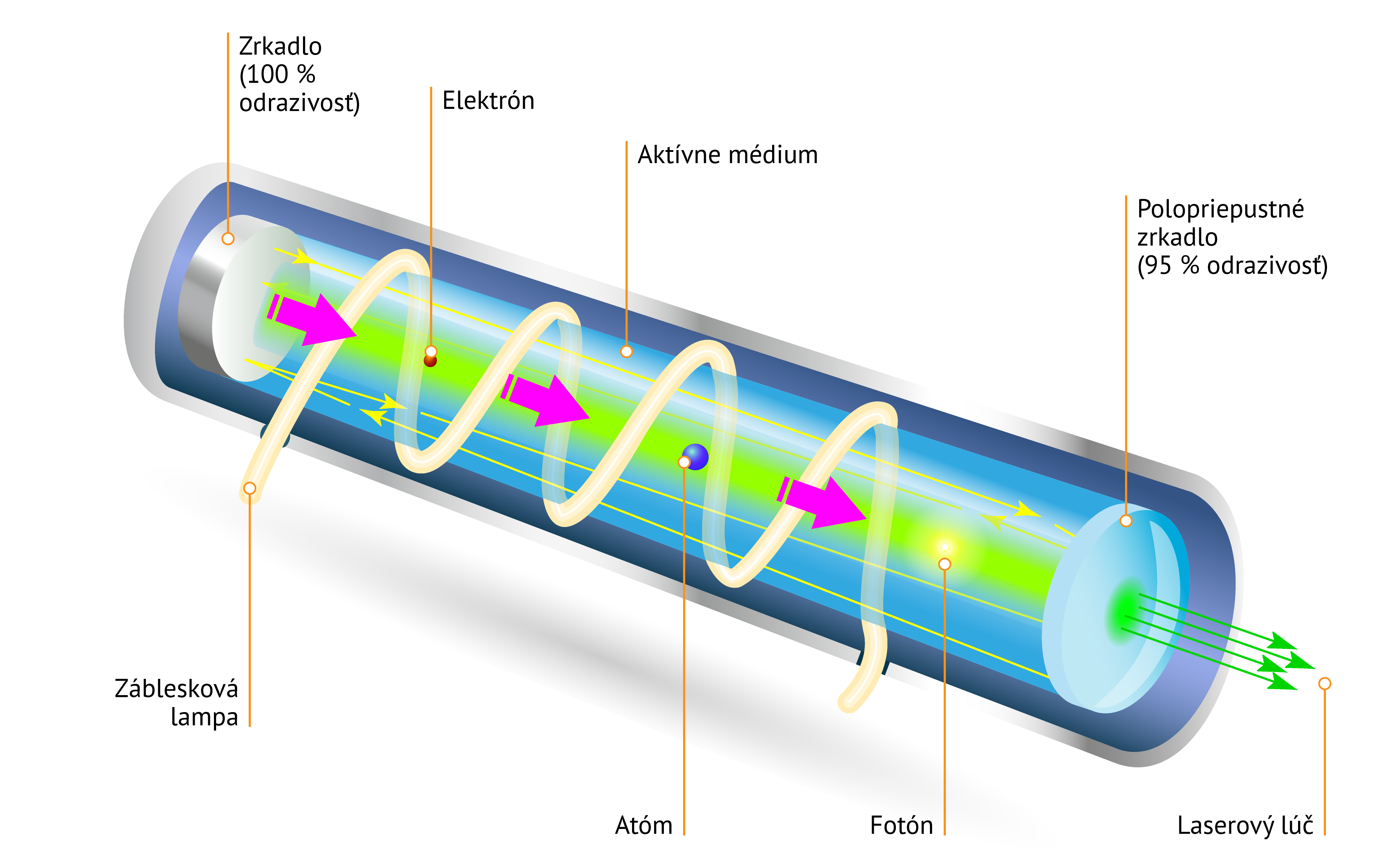 Princíp činnosti je založený na stimulovanej emisii žiarenia. Aktívne optické médium je osvetlené zdrojom energie (napr. zábleskovou lampou), čím dochádza k excitácii elektrónov. Pri deexcitácii uvoľňujú elektróny fotóny s rovnakou vlnovou dĺžkou. Svetlo sa odráža medzi zrkadlami umiestnenými na koncoch optického média a pri prechode vyvoláva ďalšie stimulované emisie. Výsledkom je lúč koherentného, monochromatického žiarenia. Podľa prostredia, v ktorom dochádza ku generácii, sa lasery delia na plynové, z pevnej látky, polovodičové a pod.