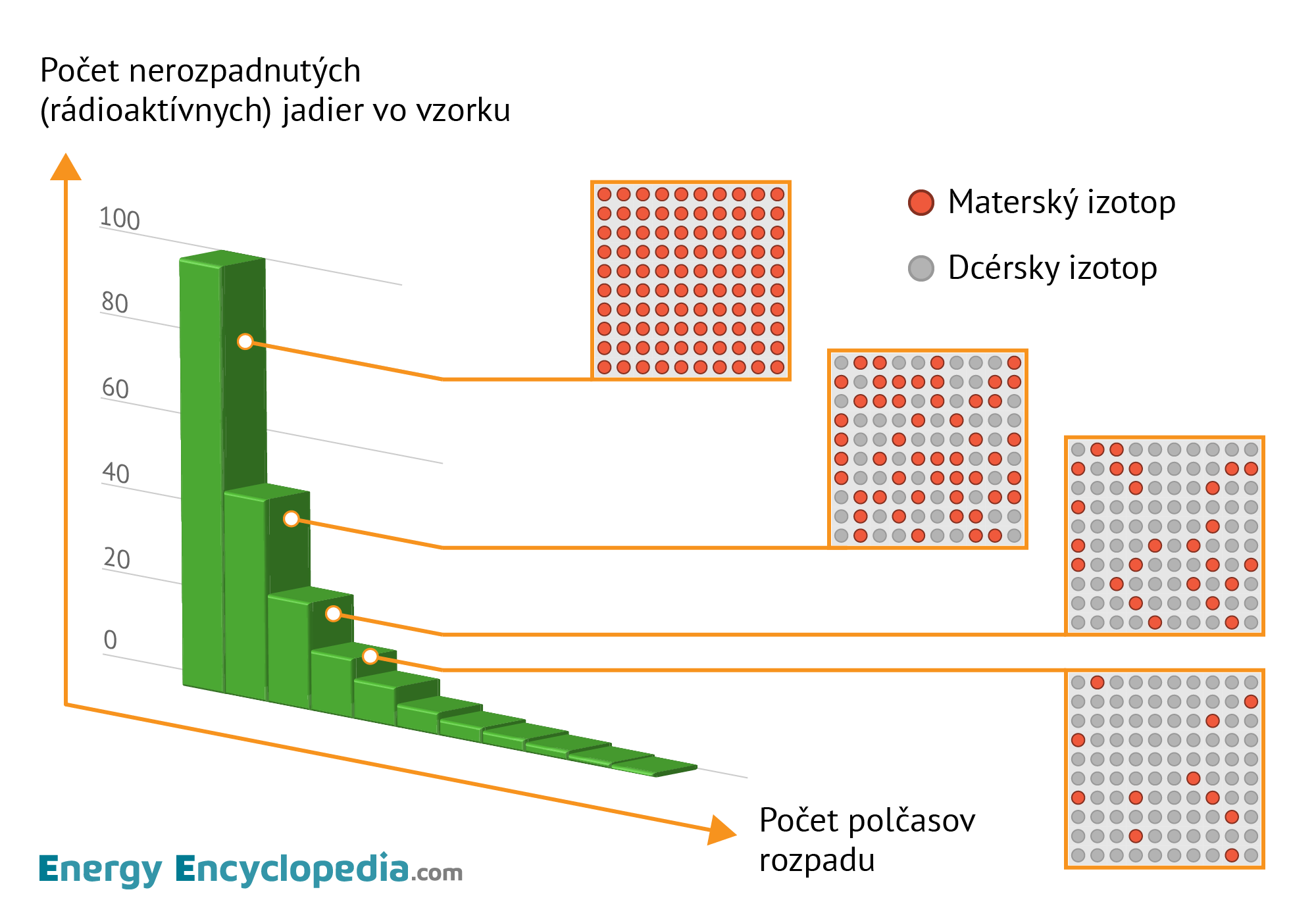 Napríklad, ak máme 4 gramy kobaltu-60, ktorého polčas rozpadu je 5,26 roka, po uplynutí tohto času zostanú v vzorke 2 gramy kobaltu-60. Po ďalšom polčase rozpadu zostane už len 1 gram pôvodného izotopu.